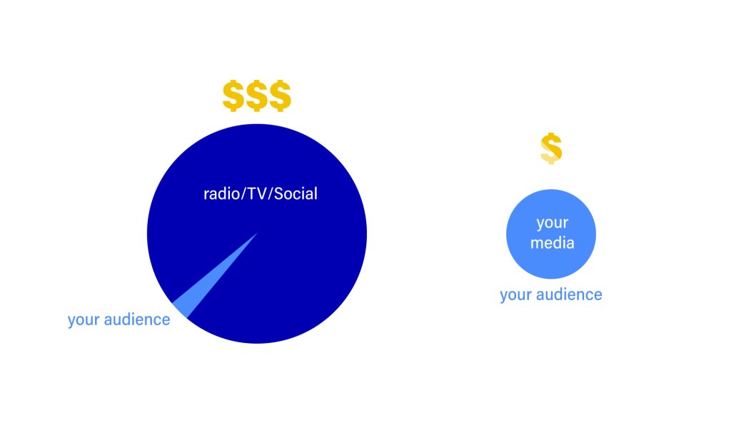 In the left bubble you may a lot more to reach audiences that aren’t a good fit. In the right bubble, you only pay for audiences you want to reach. But the cost savings continues when you realize you’re not financially dependent on advertisers.